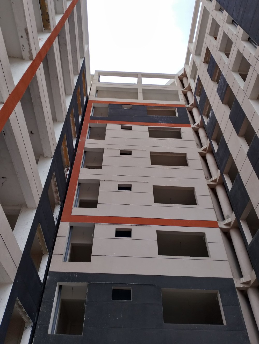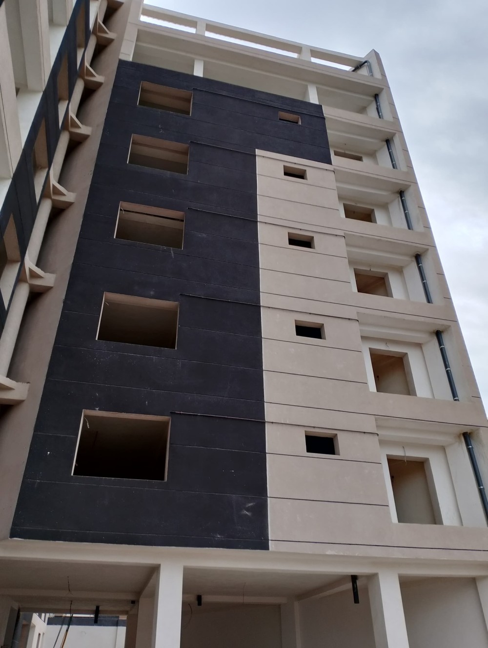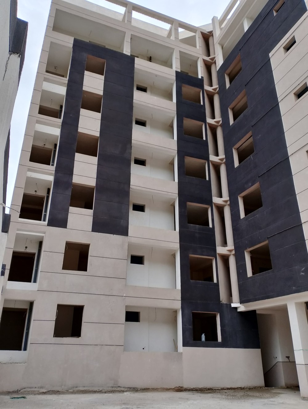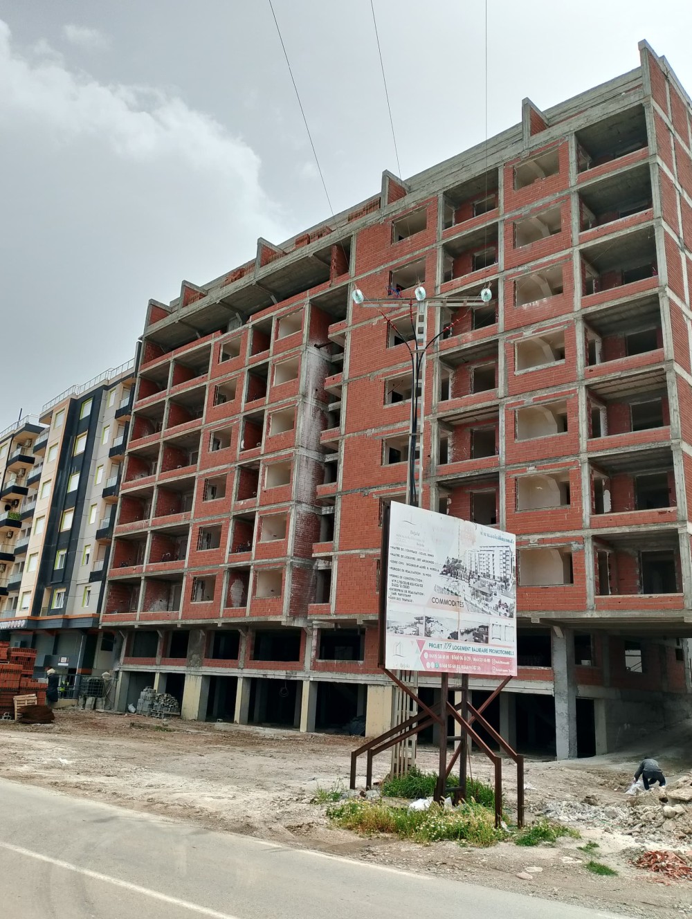- Les deux blocs s’élèvent en R+7 avec deux entres-sol, aménagés en box parking + commerces, le reste est aménagé en appartements de type F2 et F3, avec accès direct sur le toit de WASSIM I.